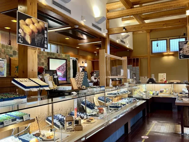 昭和30年に創業した当店は、「京都の町屋」をイメージし、栃木産の杉材と土を使った外観が特徴です。軒灯看板が印象的な佇まいで、お客様にゆっくりと商品をお選びいただけるよう、「広々とした店内」と「高い天井」を備えています。歳月とともに深みを増していく店内で、お菓子選びを心ゆくまでお楽しみいただけることを願っています。