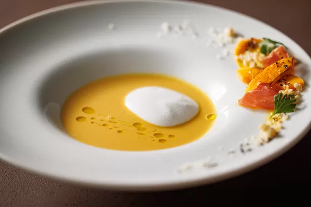 スープ :バタースクワッシュのポタージュ 生ハムとミルクフォーム