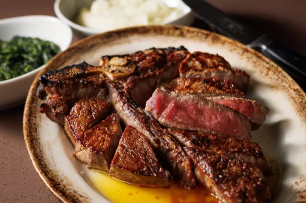メイン :(1) ポーターハウス(お一人様約200g)、マッシュポテト、スピナッチ