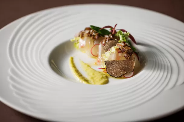 前菜 :真鯛のカルパッチョ 黒トリュフとポロネギのクーリ