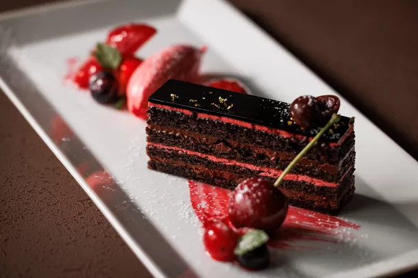 デザート:ブラックフォレスト グリオットソルベ、チェリーのブランデー漬け