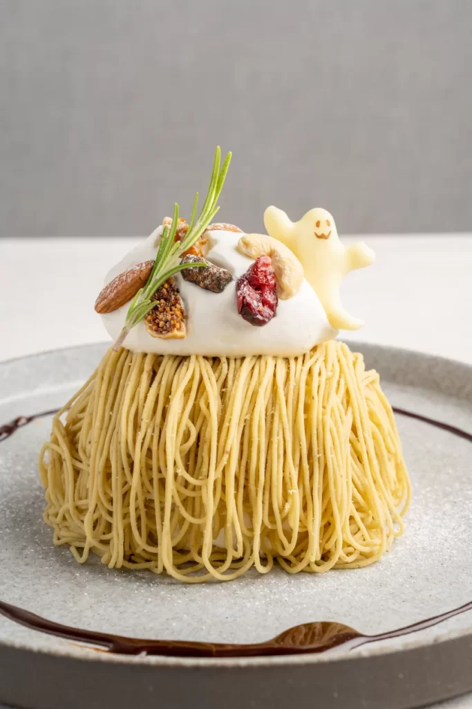 大人気の巣ごもりパンケーキ和栗がハロウィンバージョンになって登場です。ふわふわのパンケーキをほんのり甘酸っぱいカシスソースに浸し、コーヒー味のサクサクなメレンゲ、栗のリッチな味わいが口の中に広がります。通常の巣ごもりパンケーキ和栗とはまた一味も二味も変わった期間限定の味わいをお楽しみください。