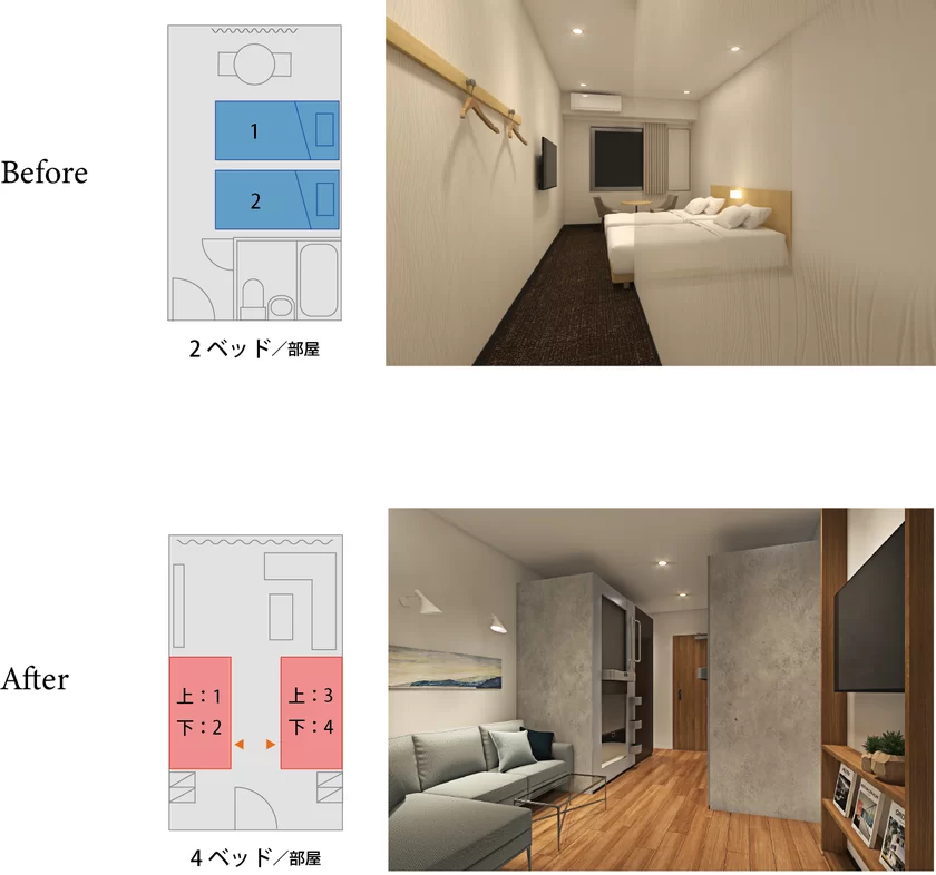 居室の床面積を保ったまま改修することにより、既存壁を流用することができるため、大掛かりな工事や長い改修期間を要しません。また、宿泊人数が倍増することで、一人当たりの単価を下げてもトータル収益の増加が見込めます。従来の客室構成では受け入れが難しかった、合宿や研修での利用もしやすくなるなど、稼働率の向上も期待できます。