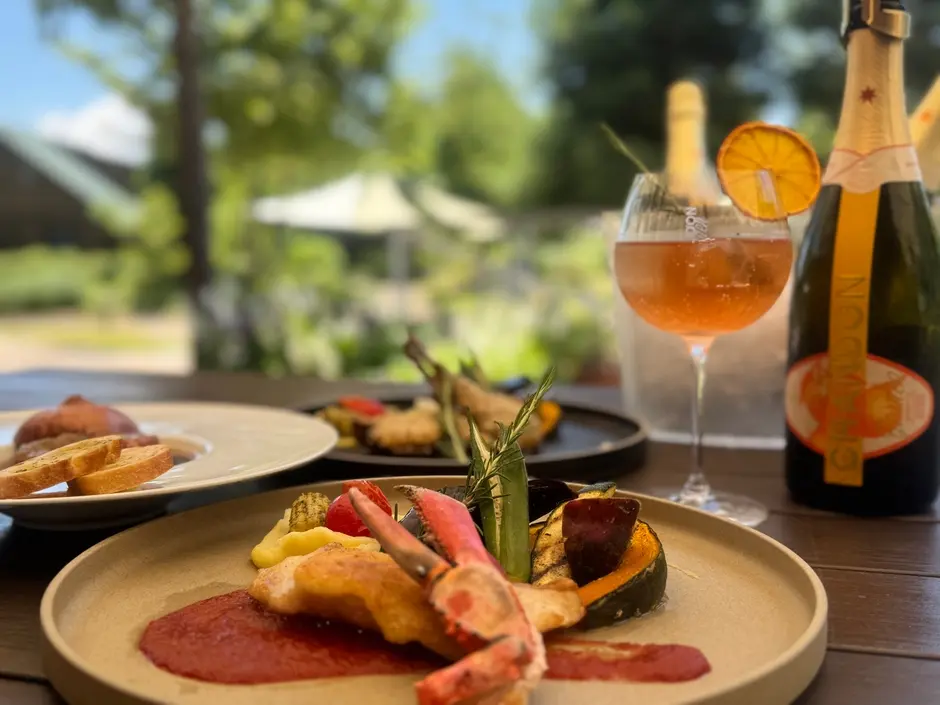 到着時に「シャンドン ガーデン スプリッツ」1本をログハウスにご用意。夜は庭園を望みながらテラスでゆったりと一杯を、翌朝はレストランで地元食材の朝食とともにさわやかなひとときをお楽しみください。